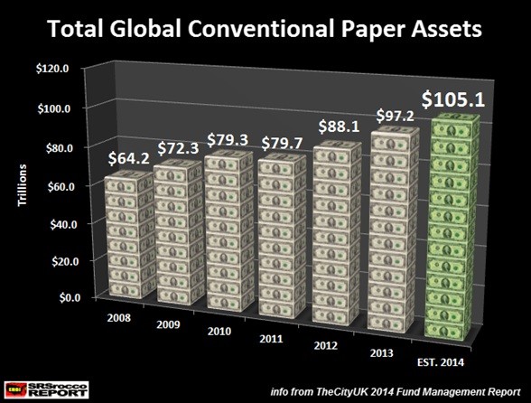 According to the CityUK 2014 Fund Management Report, total global conventional assets under management increased from $97.2 trillion in 2013 to an estimated $105.1 trillion in 2014. That’s a lot of paper and digits.