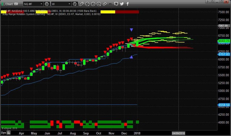 This Weekly chart of the Nasdaq (NQ) clearly shows the expected future price levels and ranges going out nearly three months into the future. You can see from this chart that the YELLOW LINES are predicting generally higher price levels through the end of February 2018 when a sudden price consolidation is expected. This will likely result in a 2~5% price decline sometime between February 21 and March 26, 2018. After this brief rotation, the Adaptive Dynamic Learning modeling system is predicting further price advancements in the range of 2~3% or more before stalling again in late April 2018. So pay attention, any lows in the NQ below 6485 are likely very strong BUY TRIGGERS.