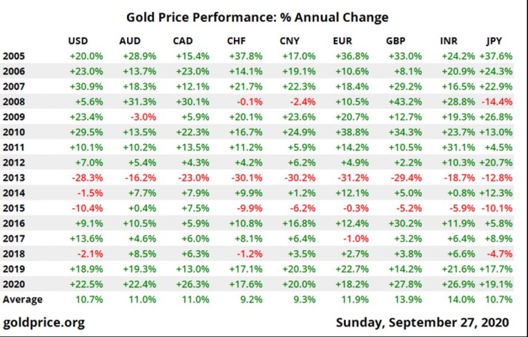 We expected the same conditions that drove price in 2019 to continue into 2020 and published a forecast back in early January of $1800 COMEX gold. As you know, price peaked near $2100 last summer and is now near $1860. That's another pretty substantial annual gain and in line with what you'd expect during a bull market. See this chart below courtesy of Ronni Stoeferle and his team at Incrementum AG: