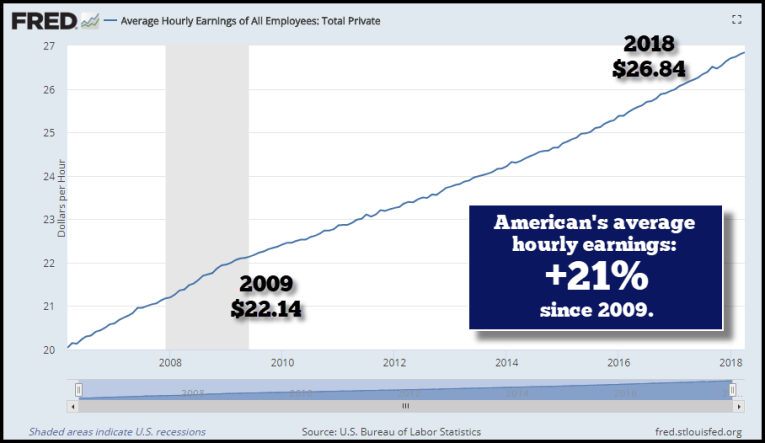 Unfortunately, wages have not kept up with rising home values. For example, the average hourly earnings have only increased 21% since 2009. However, the U.S. median home price $330,000 in Q1 2018 is 53% higher: