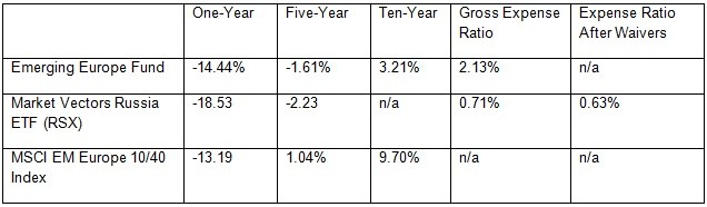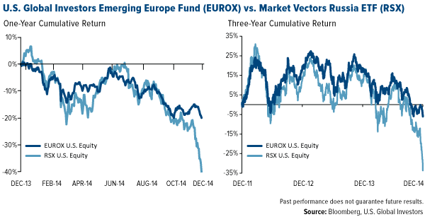 It states in our prospectus that “government policy is a precursor to change.” As such, we believe Russia poses too great of a geopolitical risk for our investors. Because of nimble active management, our Emerging Europe Fund (EUROX) now has minimal exposure to Russia, thereby avoiding losses as significant as the Market Vectors Russia ETF (RSX).