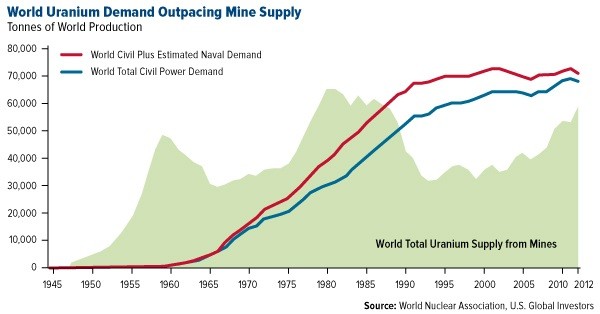 There isn’t enough uranium left to fulfill our needs if you compare the amount the U.S. produces with the amount the U.S. requires. It’s not only America. Much of the world is looking for sources of uranium to meet demand factors. The World Nuclear Organization shows in the chart below that one reason for the shortfall in uranium supply from mines is that early production went straight into military inventories and civil stockpiles.