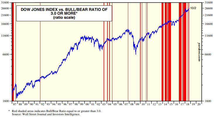 As mentioned in earlier posts, there is no better example of sentiment’s limitations as a market timing tool than the US stock market’s performance over the past few years. This is evidenced by the following chart from Yardeni.com. The chart shows the performance of the Dow Jones Industrials Index over the past 31 years with vertical red lines to indicate the weeks when the Investors Intelligence (II) Bull/Bear ratio was at least 3.0 (a bull/bear ratio of 3 or more suggests extreme optimism within the surveyed group).