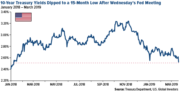 The yield on the 10-year Treasury fell to a more-than-one-year low last week on a dovish Federal Reserve. Fed Chair Jerome Powell indicated that interest rates were likely to stay unchanged throughout 2019 as officials assess the impact of a potential global economic slowdown. “Just as strong global growth was a tailwind,” Powell said, “weaker global growth can be a headwind to our economy.”