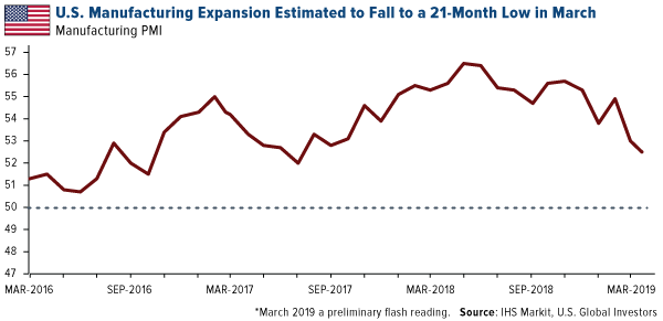 The preliminary U.S. purchasing manager’s index (PMI), released on Friday, shows manufacturing growth slowing to a 21-month low, from 53 in February to 52.5 in March. “Softer business activity growth reflected more subdued demand conditions in March, with new work rising at the weakest pace since April 2017,” the IHS Markit report reads.