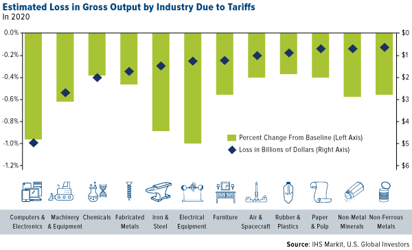 And then there’s lost export revenue and jobs to consider. According to a report this month by IHS Markit, tariffs are estimated to have a negative impact on the U.S. economy over the next 10 years. Ramifications include suppression of hundreds of thousands of American jobs, a dramatic reduction in consumers’ real spending power and a loss in gross output in a number of industries.
