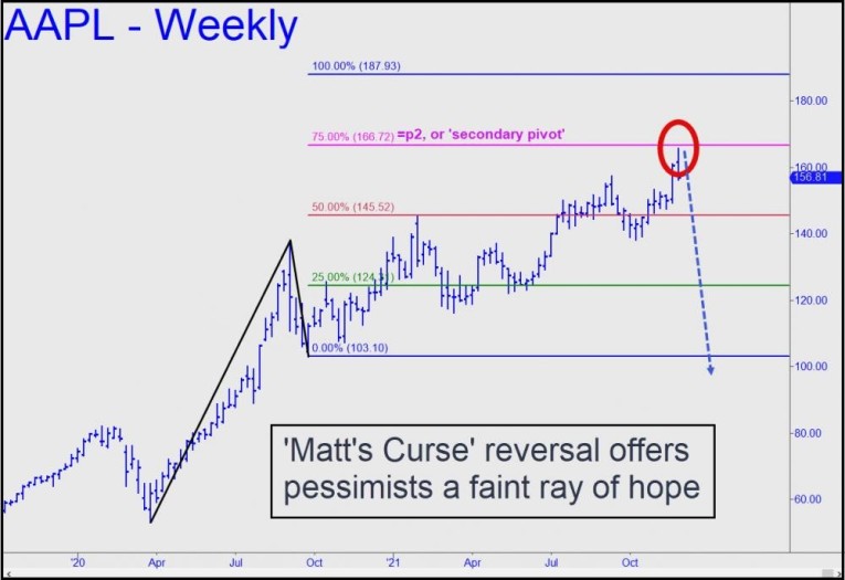 A few of my colleagues had predicted a major top about where it occurred. Peter Eliades got closest with a magic number for the E-Mini S&Ps the caught the high within a point. My own projection missed by 20 points, or less than half a percentage point -- close enough, it would seem, to deserve a victory lap over the weekend. That was until I had a closer look at AAPL's chart. The stock got hit hard, down almost 3%, but there is no escaping the fact that if it were to fall a further 5%, to 146, it would become a screaming 'buy', according to the rules of my Hidden Pivot Trading System. Since AAPL more than any other stocks reflects both the fears and the highest aspirations of portfolio managers, not to mention their unmitigated greed, hubris and stupidity, we shouldn't be too hasty in assuming that Friday's carnage will mark the beginning of the end of the stock market's nearly 13-year bull run. But I wouldn't given up on the idea entirely, since AAPL's stall occurred in an unusually perilous place. Specifically, the rally failed precisely at the 'secondary' pivot of a major rally pattern, as the chart shows. This will subject AAPL to the dark jeopardy of Matt's Curse, implying it could fall below $103 instead of rallying to $188 as might be expected in the absence of voodoo technicals. We shall see, but the 'mechanical buy' in AAPL will remain valid in any event, as will the bullish implications this has for the stock market as a whole.