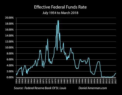 The above is a graph of the effective Federal Funds Rate from 1954 through March of 2018 (that final data point for March is not yet actual data, but is projected from the recent Fed meeting). Our starting point is the economic recession of 1990.