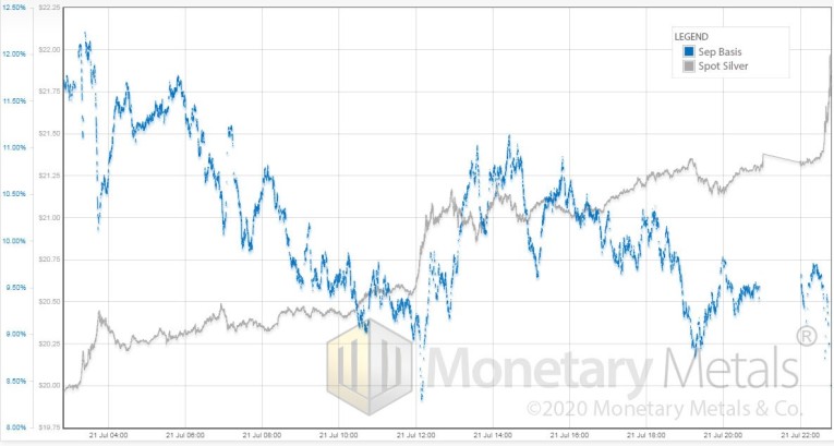 We refer to a day with rising price and falling basis. That means as the price increased, the basis decreased. As silver went from $20 to $22, the basis went from 11.6% to 8.5%.
