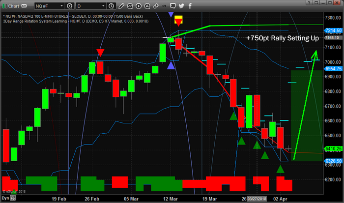 Additionally, when we compare the ES chart (above) to this NQ chart (below), we can see another price anomaly that is setting up in the US markets. These types of price anomalies are quite unique in the sense that they represent a price disconnect that usually results in a violent and dramatic price reconnect. In other words, when these types of price anomalies happen, price is driven outside normal boundaries of operation for periods of time, then it recovers to near the projected price levels – just like it did in early February 2018 with a dramatic downside price correction.