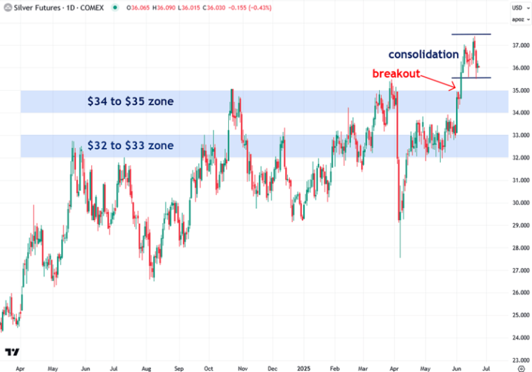 Let’s start with the basics: the COMEX silver futures chart, which I closely monitor because it tends to respect $1 increments as key support and resistance levels. Two major resistance zones had capped silver’s progress for much of the past year—$32 to $33 and $34 to $35—until the breakout in early June finally pushed prices through those barriers.