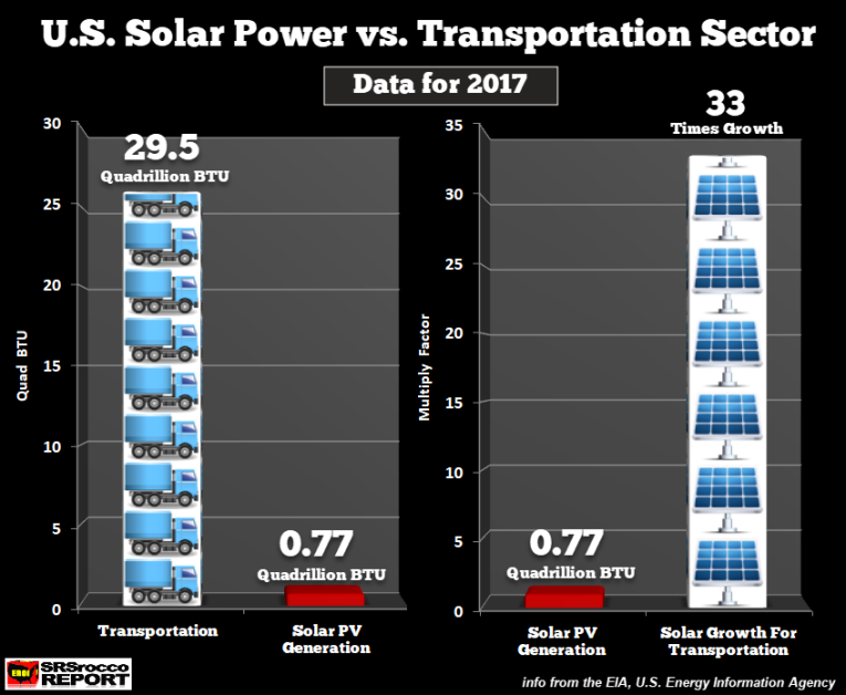 According to the EIA, the U.S. Energy Information Agency, total U.S. solar power generation in 2017 was 0.77 Quadrillion BTU’s versus 29.5 Quad BTU’s consumed by the entire domestic transportation sector… cars, buses, trucks, and trains. To give you an idea of how much 1 Quad BTU equals, it represents the energy in 170 million barrels of oil. Thus, the U.S. transportation sector consumes 29.5 times that amount or roughly 5 billion barrels of oil per year.