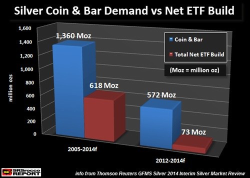 From 2005 to 2014 (2014 is forecasted & subject to revision), investors purchased 1.36 billion oz of silver coins and bars, while silver ETF’s saw a net build of 618 Moz. Basically, physical silver investment was more than double the amount of silver ETF builds.