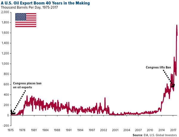 The 40-year-old ban restricting U.S. oil exports was lifted in December 2015, and between then and October 2017, exports skyrocketed nearly 300 percent.