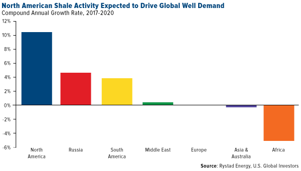 “North American shale activity is the primary mechanism driving growth globally,” writes energy consulting firm Rystad Energy in its January global well market outlook. The group adds that the number of wells “completed in North America increased 40 percent in 2017, and we expect 11 percent average annual growth toward 2020.”