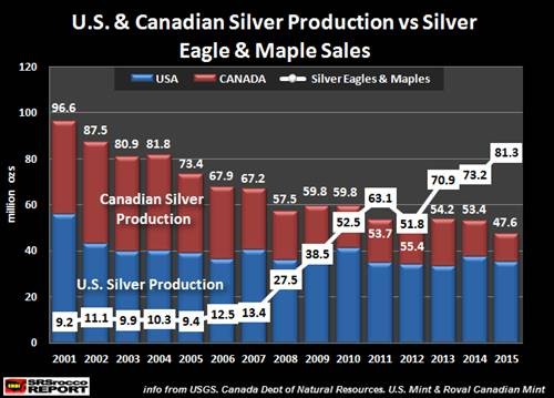 As the chart above shows, U.S. and Canada had to import nearly 34 Moz of silver in 2015 just to supply the surging Silver Eagle & Maple demand of 81.3 Moz, as their combined silver production of 47.6 Moz fell significantly short.  This was a huge change since 2001, as the U.S. and Canada had 87.4 Moz of their domestic silver mine supply remaining after 9.2 Moz went to their U.S. Eagle and Maple sales.