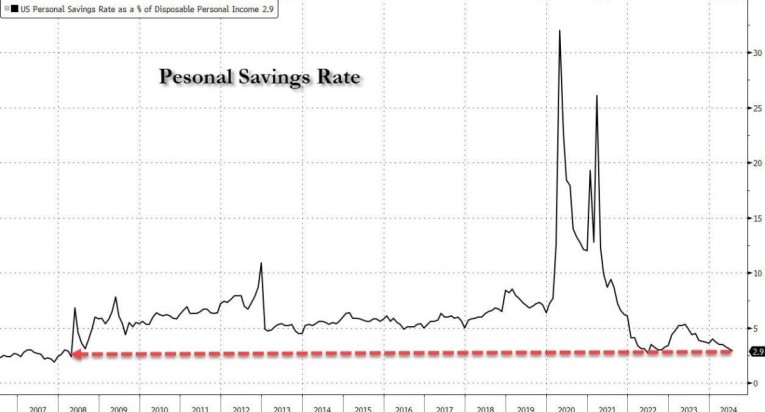 According to the San Francisco Federal Reserve, Americans have blown through all of the $2.2 trillion in excess savings accumulated during the pandemic years. Excess savings are now $72 million below pre-pandemic levels.