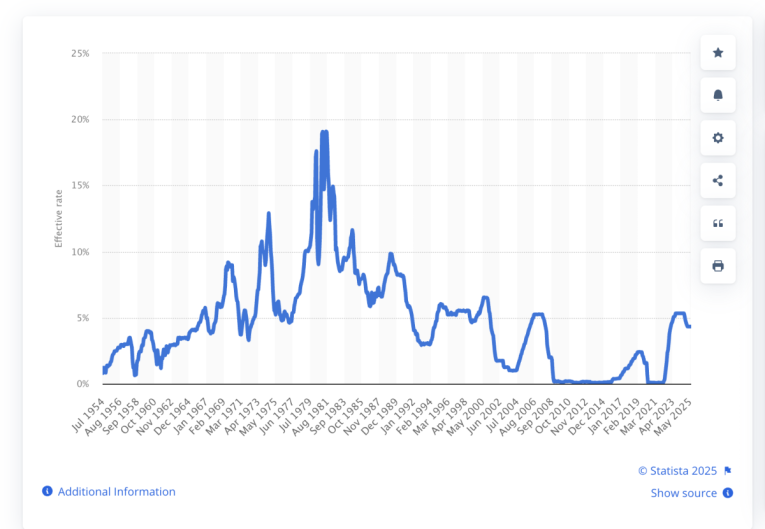 You’ll note a general downward ratchet effect in rates over time. Each interest rate peak preceding a bust gets lower as the economy has become more addicted to easy money.