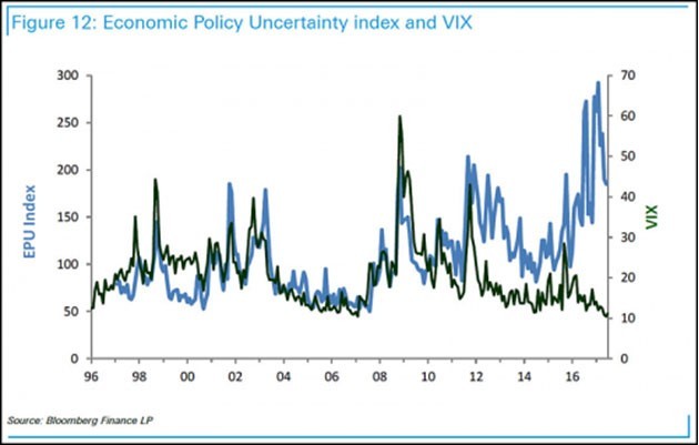 The chart below shows the EPU in blue and the VIX in black going back to 1996. Note that the two indices track each other well until 2012 and then they diverge.