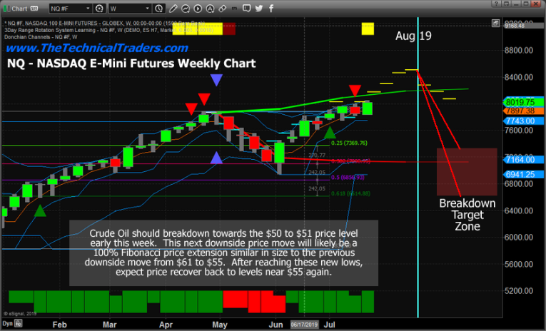 We have been suggesting that traders continue to scale back long positions before this peak is reached. Ideally, we urge traders to pull some profits off the table and to prepare for this potential rotation in price as well as to prepare for increased volatility near or after August 19, 2019. Our extended research suggests deeper support is found near $6700 and we believe a volatility increase could drive prices towards these levels in a reversion price rotation.