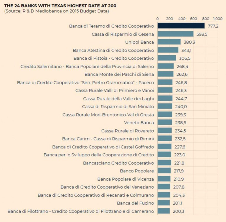 The bureaucrats in the likes of the ECB aren’t worried about the majority of the Italian banks with a Texas ratio of over 100 as they are small local or regional savings banks with tens or hundreds of millions of euros in assets. But when a reading of over 100 basically means they don’t have enough money to pay for the bad loans, what happens to the people who have their money with these small banks?