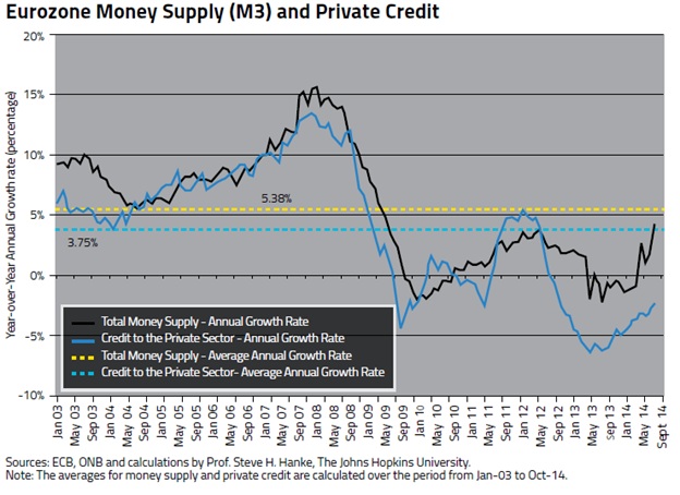 The money supply in Europe is growing, but credit has been contracting since late 2012 (see the accompanying chart). Why? To answer this question it is necessary to determine what driving money supply growth in the Eurozone is. A large chunk of the contribution to the growth in M3 has come from an increase in bank lending to governments.