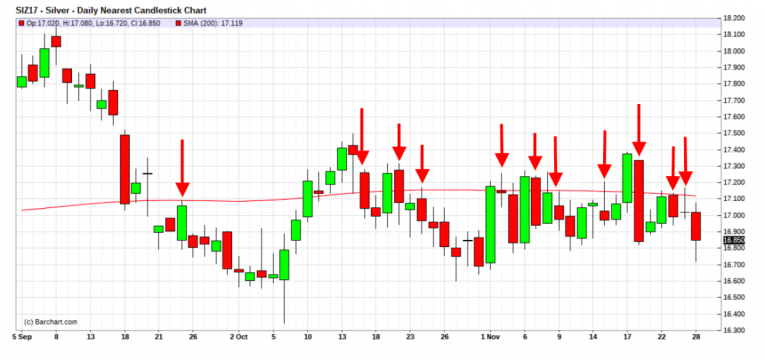 Though the chart above clearly betrays The Banks collusive and manipulative trading pattern for 2017, the chart below really brings it into focus in the present. Note the capping since price was broken below the 200-day on September 21. We've drawn ELEVEN arrows on this chart to point you to clear instances of Bank intervention to rig price back below the 200-day MA. Note, too, how frequently a one day close above the 200-day is met with a massive red candle the next.