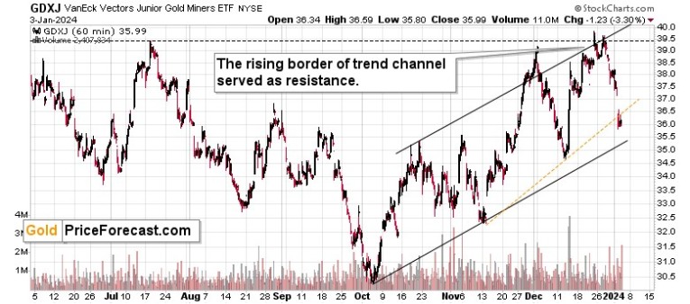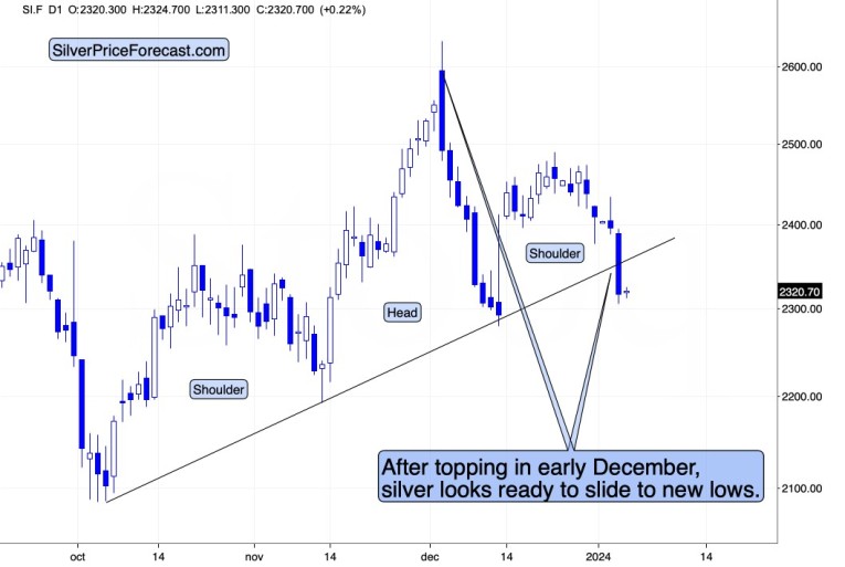 This is a major breakdown, and since the downside target based on this H&S pattern is close to the October low, we can expect a sharp downswing here. This is in perfect tune with my gold price forecast for January 2024.
