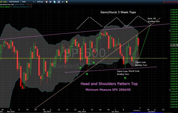 The Gann cycle shadows are suggesting a mid-session low Monday.  If we hit a new low on this move (below 2072), there is the possibility we may form a new neckline on the giant Head and Shoulders Pattern distribution top and no new highs would then be anticipated as we rally into the late June/early July expected top (as I’ve shown on the charts below).