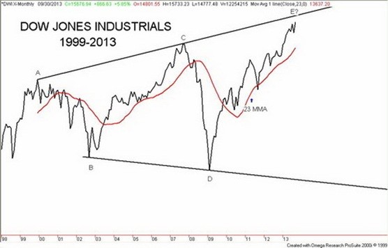 Robert McHugh has called the current pattern the “Jaws of Death” because it has the look of a shark with his mouth wide open. McHugh has noted in the past that the “Jaws of Death” or expanding or broadening triangle has been seen at other important highs. In an article dated February 17, 2012 entitled A Massive Stock Market Top is Finishing Now: The Jaws of Death Pattern Forecasts a Coming Crash noted a number of previous tops. The broadening or “Jaws of Death” pattern was seen prior to tops in 1929, 1957, 1965-1966, 1972-1973, and 1987. A broadening top seen over several weeks or months might not be unusual but seeing one that has been forming for 13 years; (2000-2013) is quite unusual.
