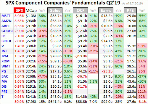 I wade through the 10-Q or 10-K SEC filings of these top SPX companies for a ton of fundamental data I feed into a spreadsheet for analysis. The highlights make it into these tables below. They start with each company’s symbol, weighting in the SPX and SPY, and market cap as of the final trading day of Q2’19. That’s followed by the year-over-year change in each company’s market capitalization, an important metric.