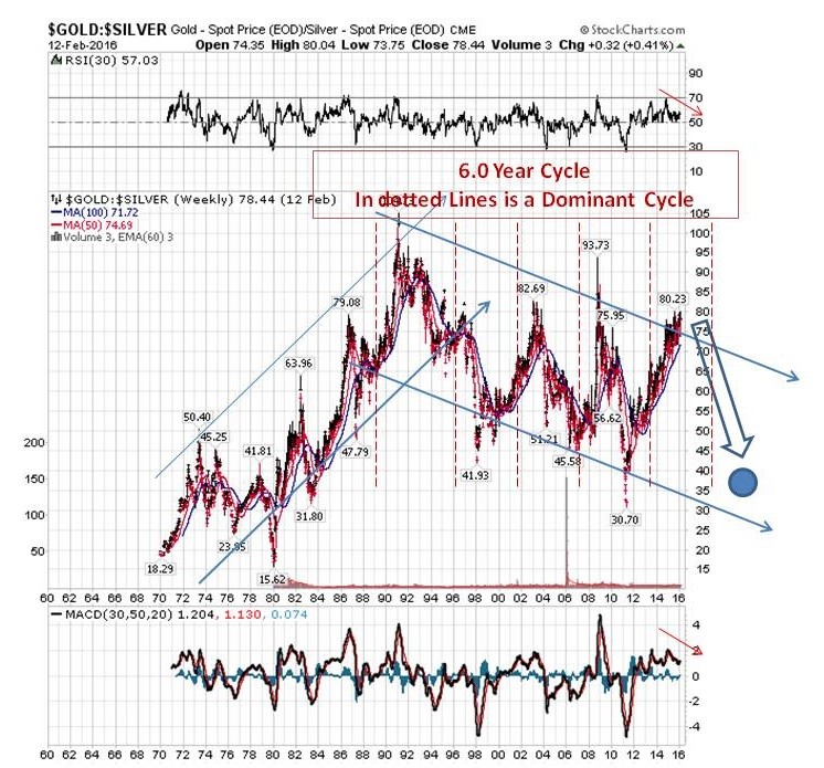 Currently, the gold/silver ratio has reached the top trend line marked in blue. The ratio will start to decline soon. The decline will continue into 2020. The dotted red lines present the 6 year cycle with more discussion in the next section on Fourier cycle analysis.
