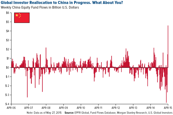 Like Indian equities, Chinese equities are attracting massive amounts of fund inflows. For the week ending May 27, global investors reallocated $4.6 billion to A-shares ahead of FTSE indexing.