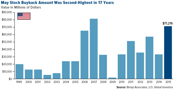Stock market research firm Birinyi Associates reports that U.S. companies repurchased over $71 billion of shares in May alone.