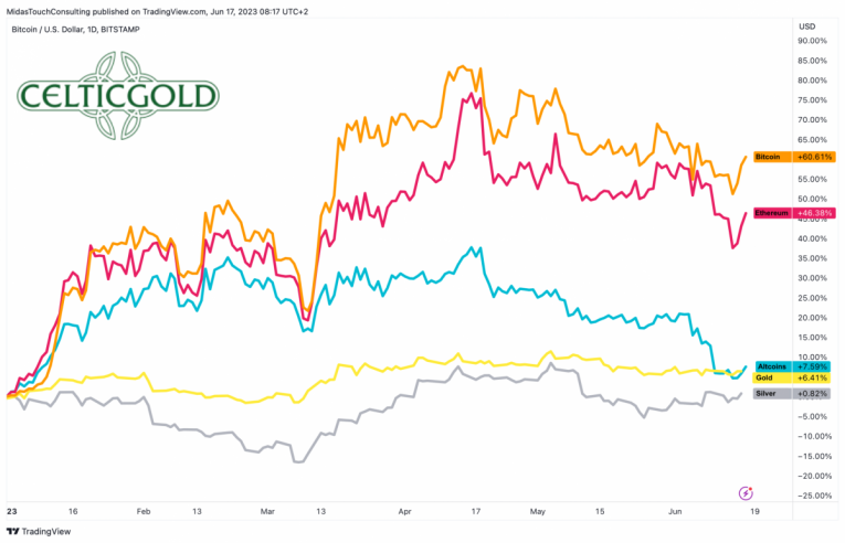 Bitcoin vs. Ethereum vs. altcoins vs. Gold vs. Silver in USD year-to-date, as of June 17th, 2023. Source: Tradingview