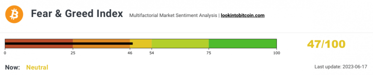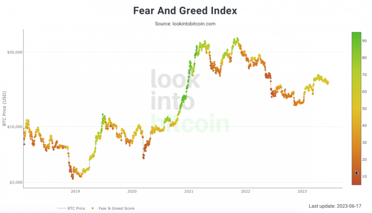 Crypto Fear & Greed Index, as of June 17th, 2023. Source: Lookintobitcoin