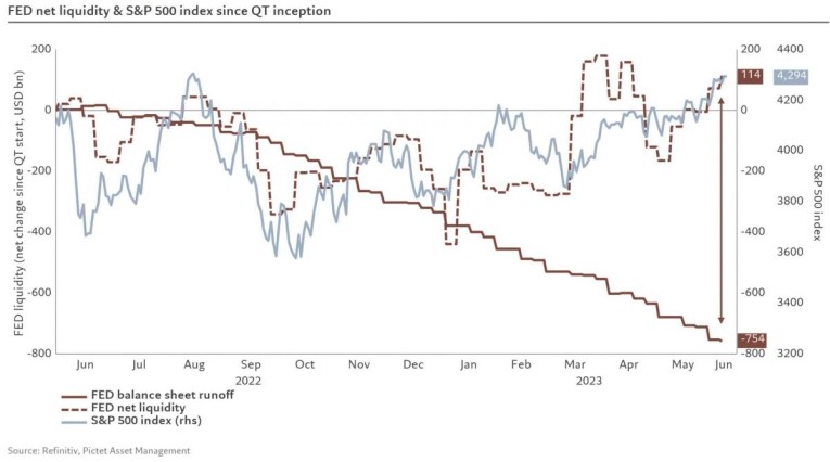FED balance sheet vs. net liquidity vs. S&P 500, as of June 9th, 2023. Source: Pictet Asset Management