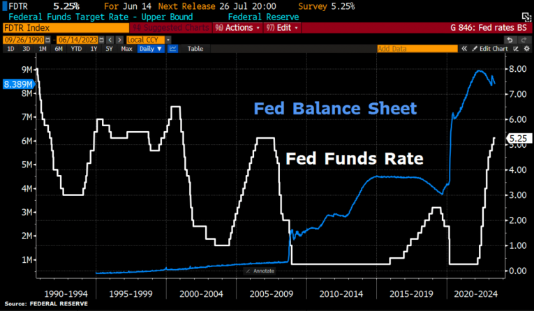 US FED balance sheet vs. FED funds rate, as of June 14th, 2023. Source: Holger Zschaepitz