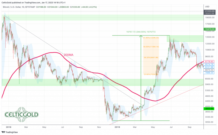 A comparative look into the past shows that Bitcoin, pretty much like in 2019, was suddenly given a new lease of life after a brutal bear market that ended with a basing pattern lasting several months. Back in 2019, Bitcoin managed to rise 328% from 3,200 USD to around 13,800 USD. The four-and-a-half-month rally did not offer any major pullbacks for an entry! Rather, more than 61.8% of the previous bear market were recaptured without any major pullbacks. Should Bitcoin currently have something similar in mind, prices could recover towards approx. 48,000 USD to 50,000 USD until the summer! Even if Bitcoin would take it a bit easier in 2023, a recovery up towards the 38.2% retracement at around 35,000 USD would be easily conceivable.