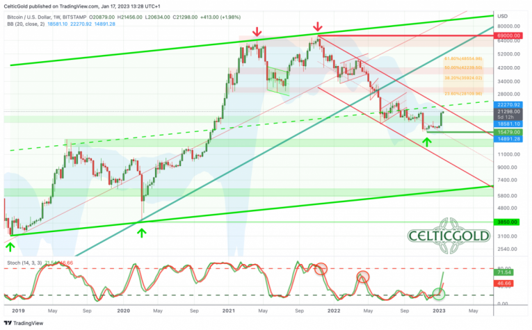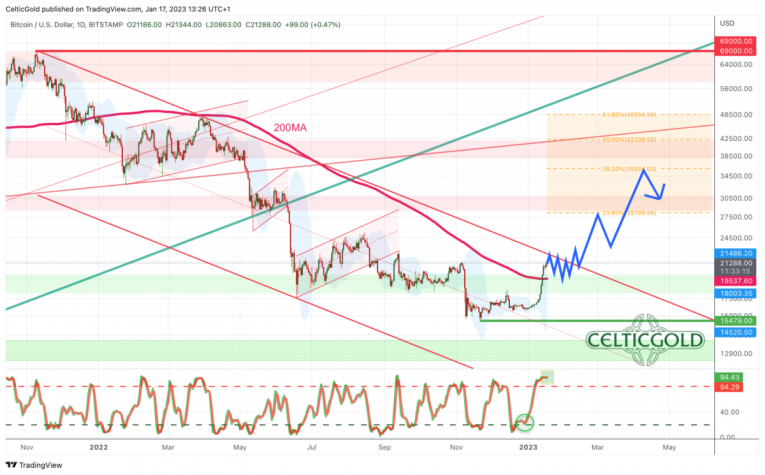 On the weekly chart, thanks to the large green weekly candle, Bitcoin has now almost reached the upper edge of the downtrend channel. Basically, a pullback could therefore take place starting between approx. 22,000 USD and 23,500 USD. However, the weekly stochastic provides a buy signal and still has room to run further towards and into the overbought zone. The upper Bollinger band (22,268 USD) does not stand in the way, neither. On a higher level, Bitcoin probably wants to approach at least one of the orange retracement levels.