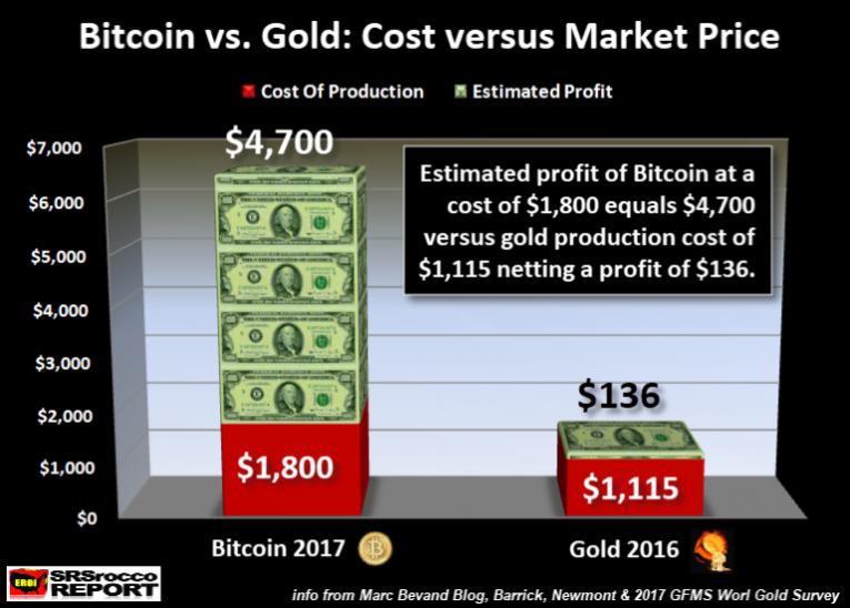 Currently, Bitcoin is fetching an estimated $4,700 profit per coin versus $136 for gold.