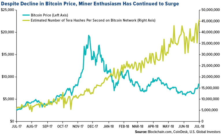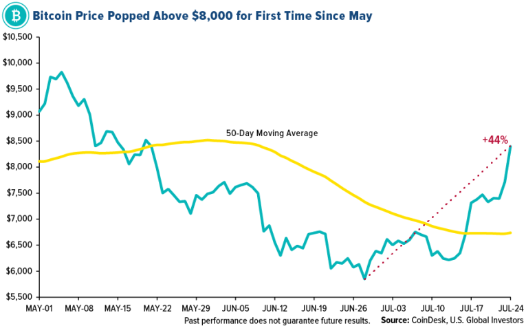 From its low of $5,850 in late May, bitcoin was up nearly 44 percent on June 24 before pulling back on the Securities and Exchange Commission’s (SEC) decision not to approve a bitcoin ETF filed by Cameron and Tyler Winklevoss. (It was back above $8,000 on Friday.) I believe bitcoin’s fundamentals are lining up for a significant move higher, its price having already broken sharply above the 50-day moving average.