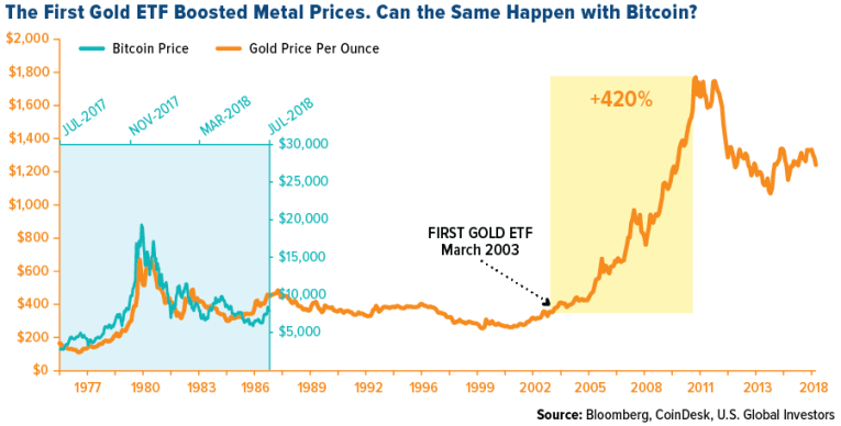 Just look at the chart below. Gold traded mostly sideways throughout the 1980s and 1990s. Then in March 2003, the first gold ETF appeared, and the price of the yellow metal skyrocketed 420 percent as trading became more liquid and streamlined. I can’t say bitcoin would respond likewise, of course, but a crypto ETF would certainly attract more curiosity to the space.