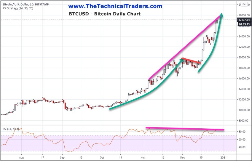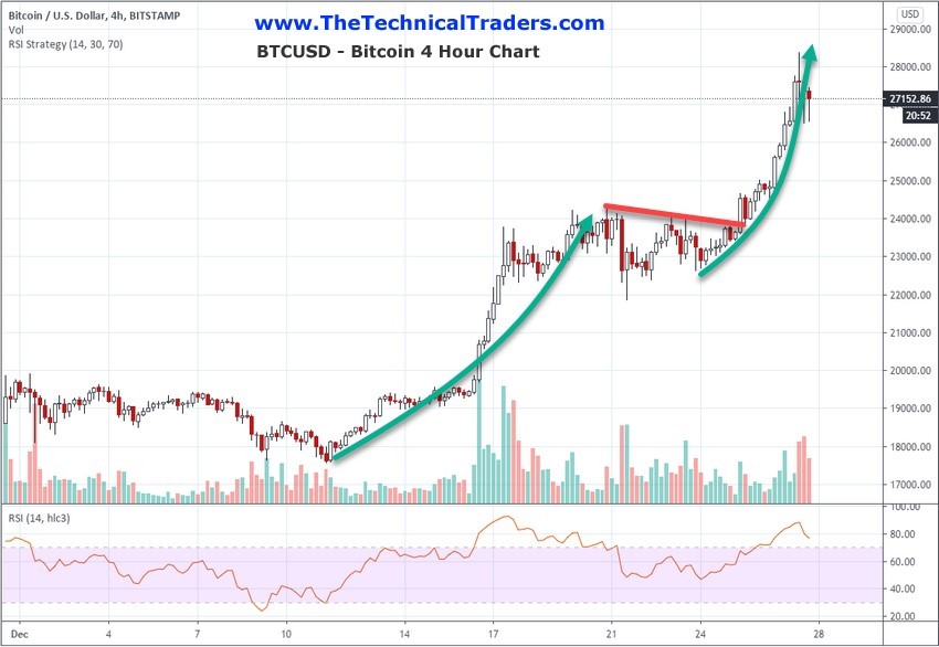 Overall, this incredible rally in Bitcoin prices before the end of 2020 has certainly proved the Bitcoin skeptics wrong and set the enthusiasts on fire. At this point, we get to see what happens in early 2021 and if this $28k level will hold up. One thing is certain, the past 30+ days have shown a massive rally potential in Bitcoin and other Cryptos – is this an excess phase peak or the start of a massive uptrend in 2021?