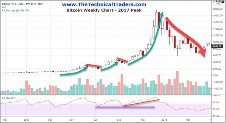 Initially, we saw a $2100 rally in Bitcoin which setup a peak near $2980 that initiated near March 26, 2017 (the first Green Arrow on this chart). After, a mild correction took place which setup a deep trough on the RSI indicator (in the lower pane of this chart). Notice how this deeper low level in RSI set up a momentum base for future trends. Then, a second rally phase pushed Bitcoin prices higher to $4979 – spanning a rally phase of nearly $3050 (the second Green Arrow). This second rally initiated near July 2017 and was followed by another brief consolidation period. Lastly, a breakout rally initiated in October 2017 and reached the peak price level on December 17, 2017 near $19,666.