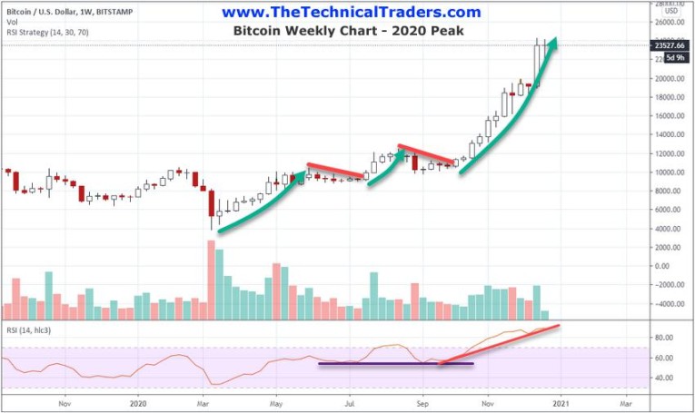 The following Weekly Bitcoin chart highlights the three rally phases that took place before the peak level was reached in December 2017. Pay very close attention to the structure you are seeing on this chart and the highlights we've made to help you understand how the price structure is being mirrored in the current rally phase.