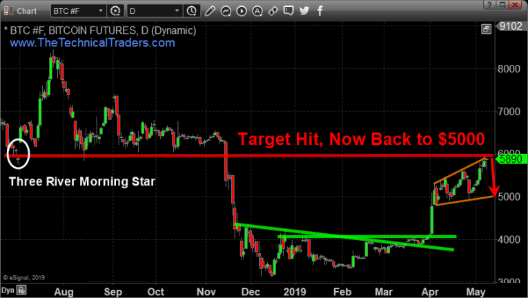 We believe the setup of the most recent price activity is setting up a classic three mountains top formation. A weak price rotation prompting a downside price move right now could be a short-term ultimately top with next support near $5000. We believe a fairly quick downside price move toward the $4400 level (or lower) – near support.