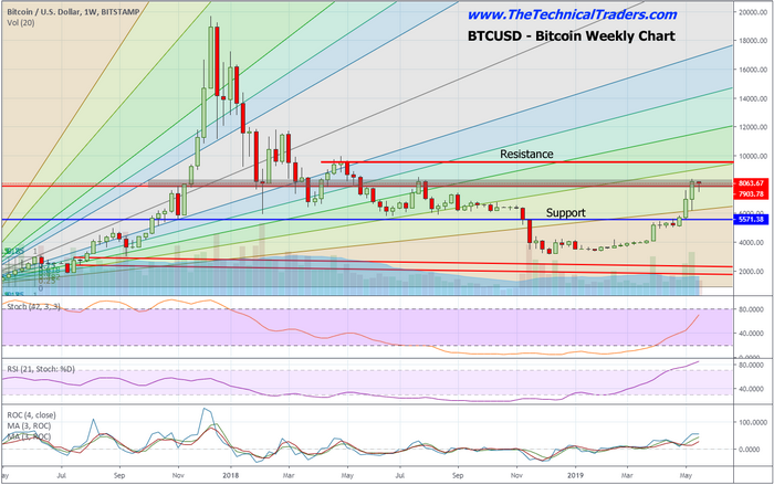 This Weekly Bitcoin chart highlights areas that we believe our current support and resistance levels. The $8000~8100 level goes all the way back to the February 2018 low. This is a critical level for trading as it became a massive price support level back in 2018 – and eventually became critical resistance in July 2018. Additional resistance is found near $9900.
