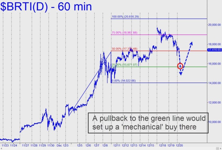 We hold a position consisting of two round lots with a cost basis that has been reduced by profit-taking to 14022. Entry came on December 8 via an explicit recommendation to get long at 16042. The paper-trade was offered mainly to demonstrate the ease and effectiveness of a tactic known by Rick’s Picks subscribers as a ‘mechanical’ entry. This set-up is designed to hold risk and reward constant at 1:3 from entry to exit. My current price target is 22,101, a ‘Hidden Pivot’ resistance that is also my minimum upside projection for $BRTI, a non-trading CME symbol that aggregates the order books of some the most popular bitcoin exchanges. I am now recommending that traders exit a third round lot (from an original four) at 20616.