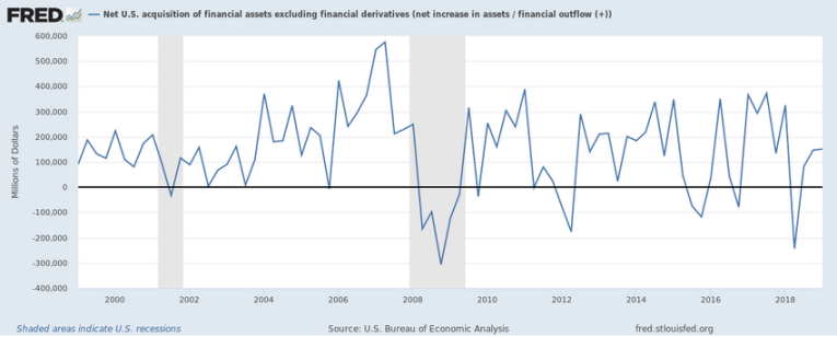 Net US Acquisitions of non-derivatives assets have been relatively tame over the past 6+ years. We can see from this chart the continued acquisition of assets from 2002 through 2007-08 – just before the credit crisis event. Then, we can see how dramatically the assets were dumped between 2007 and 2009. We're not seeing that type of setup or event play out currently in the US.